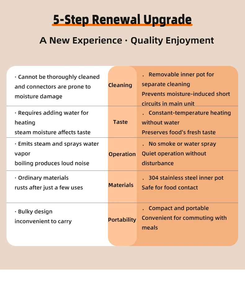 6.Material & heating notes: The electric lunch box is made of food grade PP plastic and 304 stainless steel, which is high-temperature resistant, non-toxic, durable, eco- friendly and safe to use.